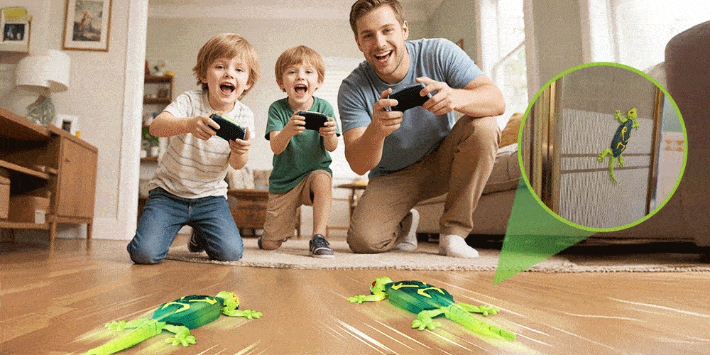 Duvara ve cama tırmanabilen uzaktan kumandalı kertenkele, 360° hareket kabiliyeti ve ışıklı gözleriyle çocuklara gerçekçi ve eğlenceli bir oyun deneyimi sunar.